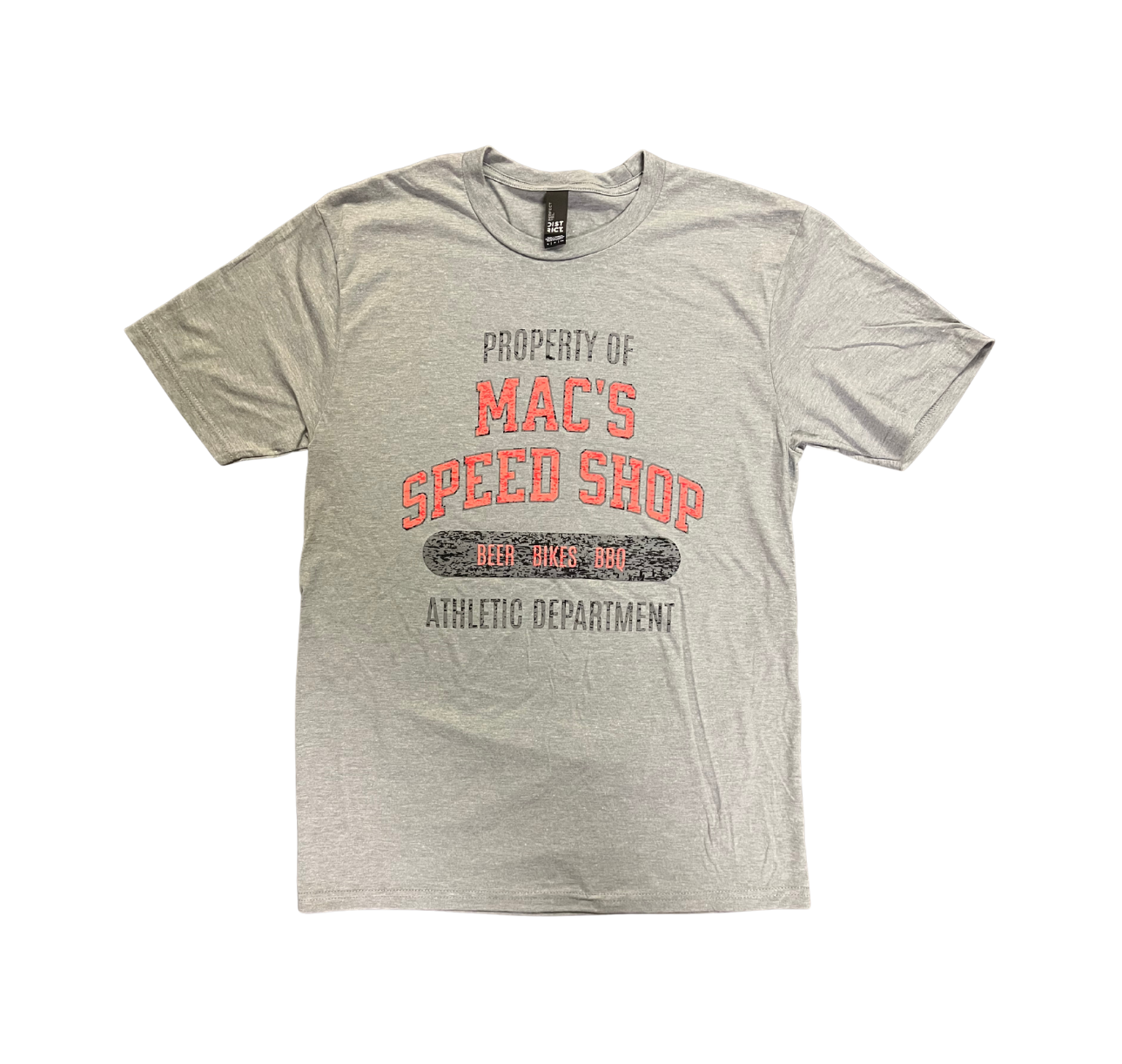 Soft grey tee with "Property of Mac's Speed Shop - Beer Bikes BBQ - Athletic Department" faded graphic on front